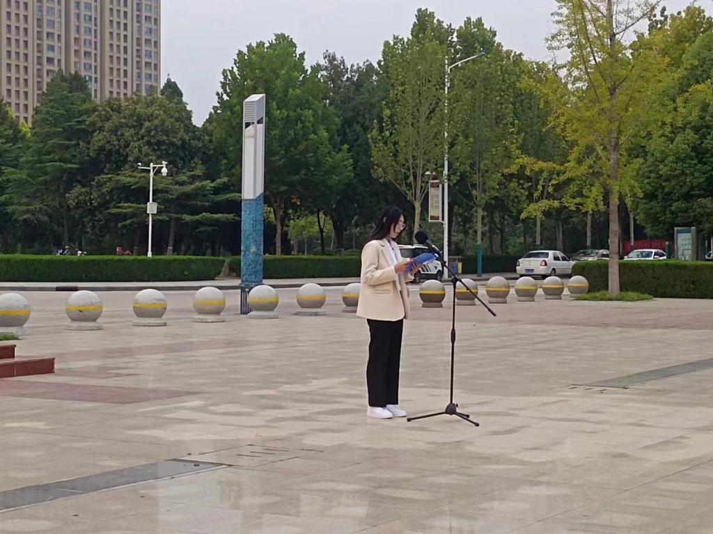 紧接着,由学生代表刘栗君同学发言。她激情昂扬的讲话内容,展现了新时代大学生的爱国情怀与满腔热血。她代表全体学生庄严承诺,将以“守诚、求新、创业、修能”的校训作为自身的标准,在日后的工作学习中谨记恩师教导,求真务实,志存高远,拼搏向上。