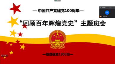 4月27日,为认真贯彻落实习近平总书记在党史学习教育动员大会上的重要讲话精神,传承红色基因,刘剑锋老师召开了地理信息1803班“回顾百年辉煌党史”主题班会,向建党100周年献礼。由于本学期学生顶岗实习,目前分布在全国各地,本次会议采用线上会议形式开展。