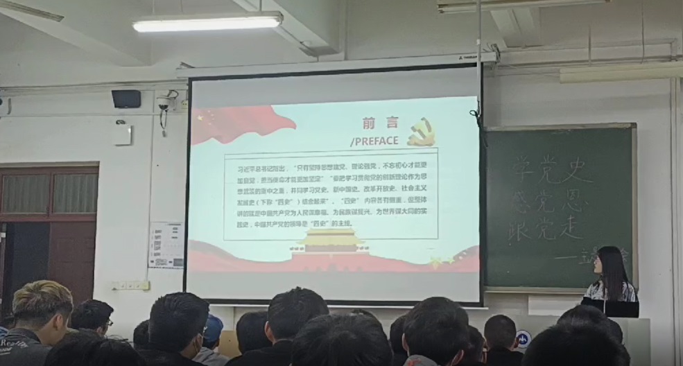 为庆祝中国共产党成立100周年,激发学生爱党、爱国的热情,引导学生传承红色基因,践行社会主义核心价值观,4月20日,辅导员赵欣在JX2101为测绘技术1901-1904、测绘工程1901班学生开展了以“知史爱党,知史爱国”为主题的班会活动。