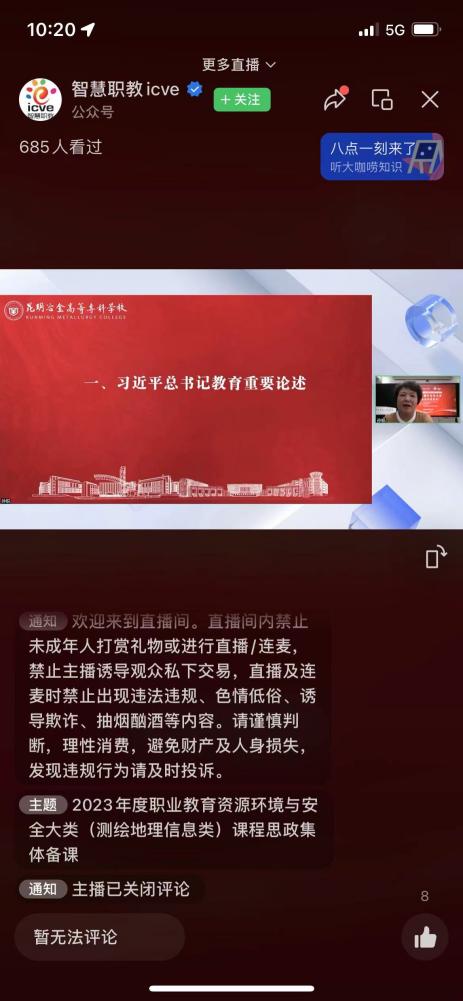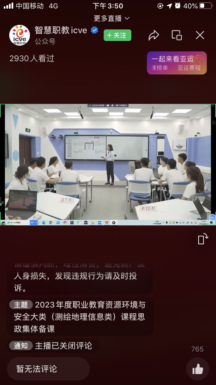 2023年9月25日,测绘工程学院全体教师参加了智慧职教平台线上举办的2023年度课程思政资源环境与安全大类(测绘地理信息类)集体备课活动,国家级课程思政示范课程《GNSS定位测量》团队负责人何宽及团队成员陈琳、陈慧,代表MG冰球突破官网网站进行了课程说课和课堂教学展示,其余教师也参加了线上学习。