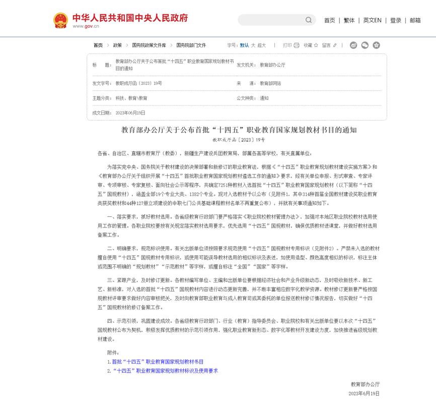 图1 教育部办公厅关于公布首批“十四五”职业教育国家规划教材书目的通知
