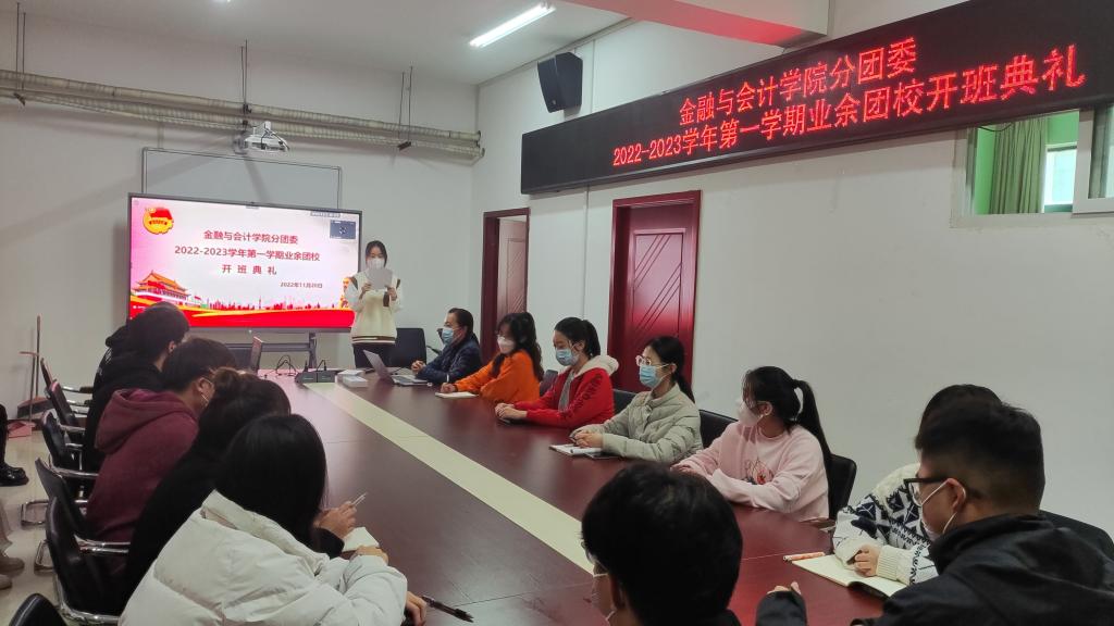 2022年1120日中午,金融与会计学院举行2022-2023学年第一学期业余团校开班典礼,院分团委书记马峥与72位团校学员出席会议。典礼由院分团委组织部学生干部付孟欣主持。