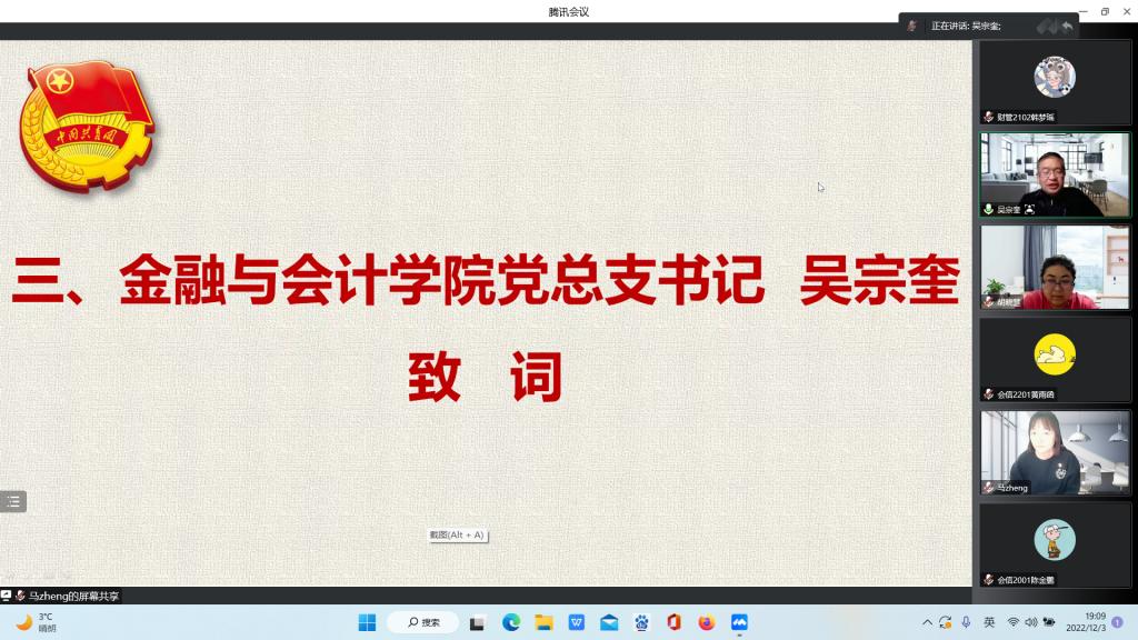 12月3日晚,金融与会计学院举行2022年学生代表大会。院党总支书记吴宗奎、党总支副书记胡晓慧、分团委书记马峥以及各年级辅导员出席了此次大会。会议由分团委书记马峥主持。
