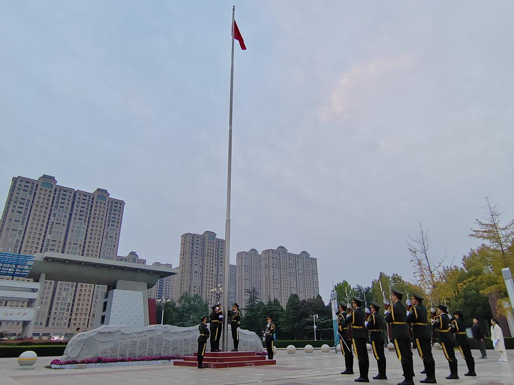 迎着朝阳,国旗护卫队迈着矫健的步伐,护卫着国旗缓缓走来,他们身姿挺拔、目光坚毅。伴随着庄严的国歌声,五星红旗伴随着旭日冉冉升起,全体师生行注目礼。2022级大数据与财务管理班李雪莉同学以“勇担时代重任,铸就无悔青春”为主题进行国旗下演讲,她号召全体学生要自觉增强爱国之情和振兴祖国的使命感,树立民族自尊心与自信心,锐意进取,自强不息,把爱国之志转化为真正的报国之行。