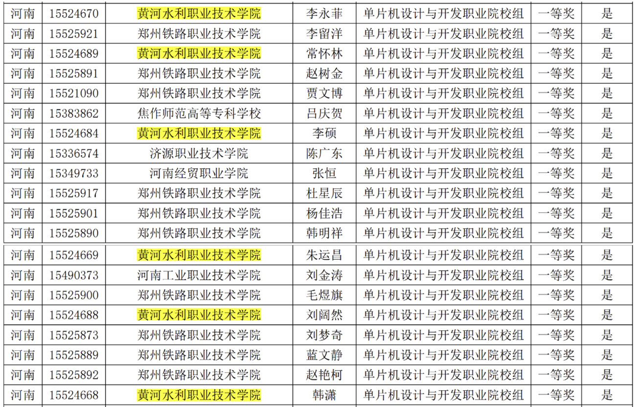 在单片机设计与开发(职业院校组)赛项中,23名同学参赛,获得河南省一等奖6项、二等奖7项、三等奖7项,李永菲荣获本赛项职业院校组一等奖第1名。