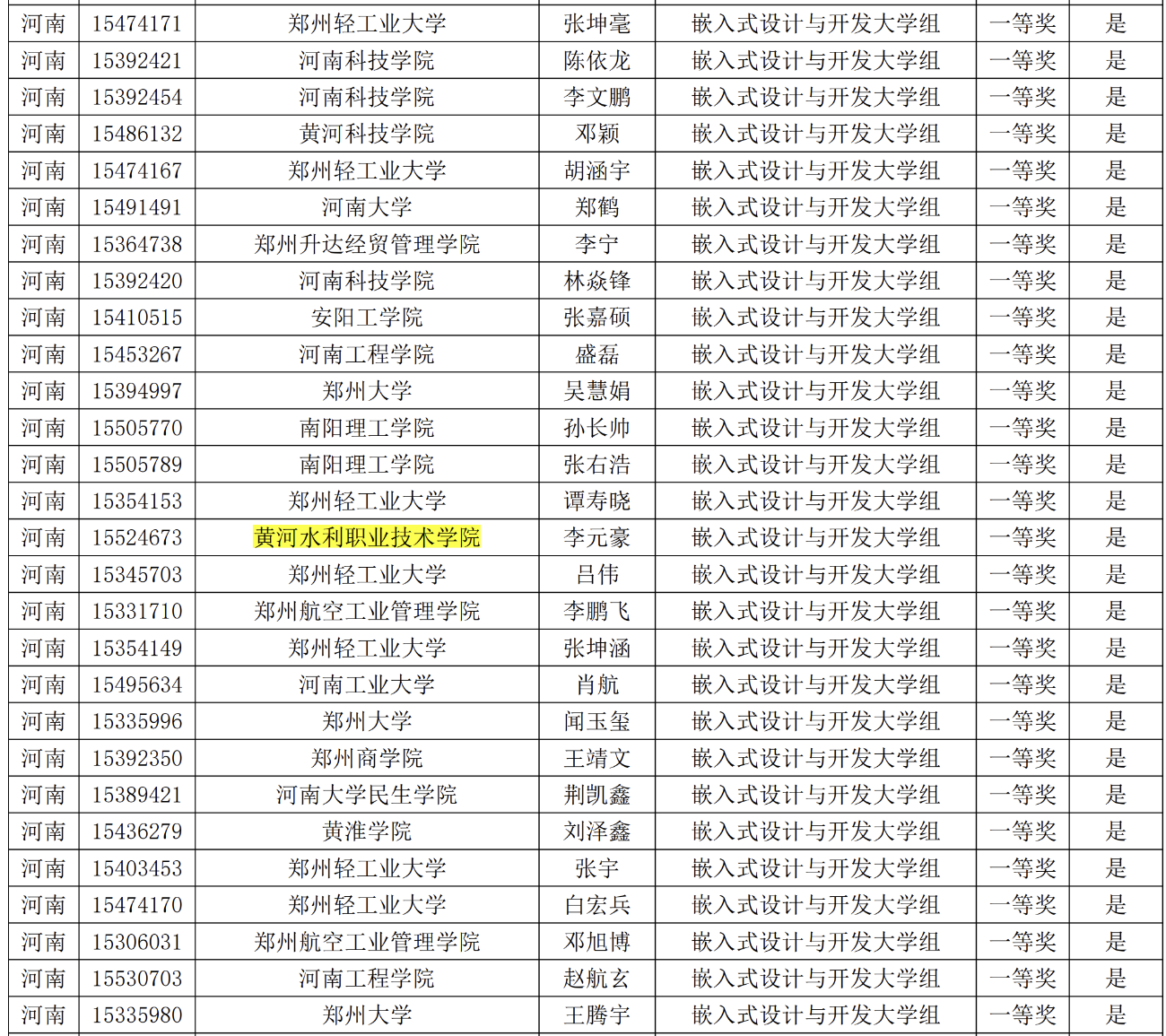 在嵌入式设计与开发(大学组)赛项中,4名同学参赛,与省内研究生、本科及高职高专学生同台竞技,获得河南省一等奖1项、二等奖3项,李元豪是全省唯一获得本赛项一等奖的高职高专学生。