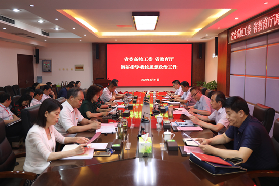 6月11日下午,以省委高校工委专职委员何秀敏为组长的省委高校工委 省教育厅调研组一行5人到冰球官网开展高校思想政治工作专题调研。座谈会在冰球官网行政楼第二会议室举行,全体校领导出席会议,党政办公室、党委组织部、党委宣传部、学生工作部、教务处、教师工作部、保卫部、校团委、马克思主义学院、科技处等部门负责人参会。座谈会由校党委书记周保平主持。
