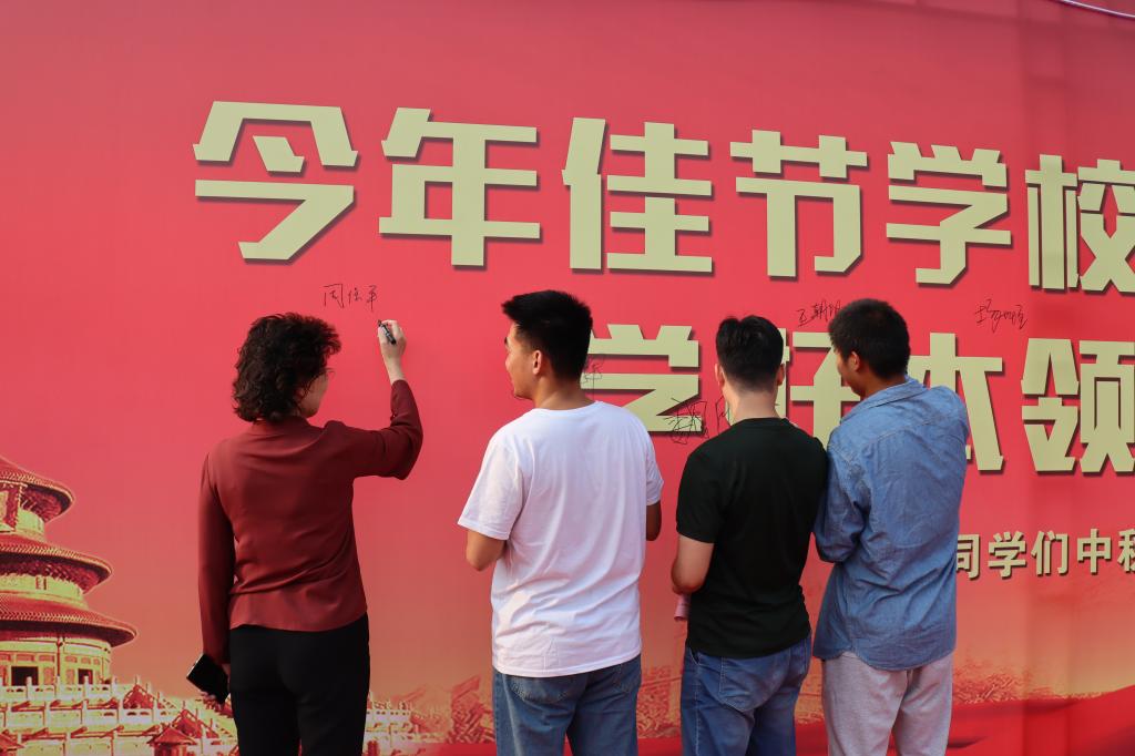 校领导和学子们纷纷在签名墙上签名留念。校领导还来到学生餐厅和学生一起品月饼、话团圆、谈家国、聊奋斗,共进晚餐。学子们无拘无束地和校领导谈学习、谈生活,整个餐厅欢声笑语、温馨欢畅。学子们纷纷表示今年虽然因为疫情没有回家,但是却度过了一个非常令人难忘的中秋国庆佳节,一定不辜负老师和家长的期望,努力学习专业知识,做一个有道德、有抱负、有情怀、有知识的新时代大学生,用满腔热情报效祖国。