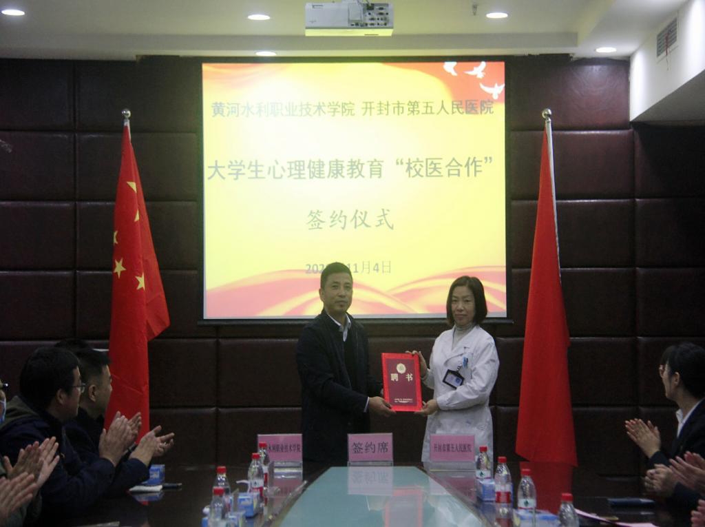 仪式上,菅浩然对市五院领导和专家们对学校心理健康教育工作的支持表示衷心感谢,并肯定了市五院在精神卫生领域取得的成就。他介绍了冰球官网的办学历程、办学特色和取得的主要成就,以及“双高校”建设和心理健康工作的开展情况。他说,黄河水院作为中国特色高水平高职学校和专业建设计划A档十所院校之一,也是中西部地区唯一、水利类职业院校唯一的“双高校”建设单位,始终坚持以人为本的育人理念,一贯重视学生心理健康教育工作。“校医合作”是冰球官网和医疗机构面向学生开展精神卫生服务的新机制,是符合实际需要的学生心理健康问题的创新防治模式,既是加快推进高校心理健康教育工作的积极尝试,也是落实健康中国行动的有力举措,相信在市五院和冰球官网共同努力下,此次的合作定会推动精神卫生健康工作结出累累硕果。菅浩然为第五人民医院心理专家代表颁发聘书。