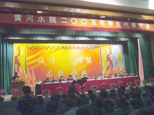 3月19日上午,黄河水院2005年学生代表大会在东校区大礼堂胜利召开。1104名学生代表受全院万余名学生的委托,欢聚一堂,共商我院学生工作大计。