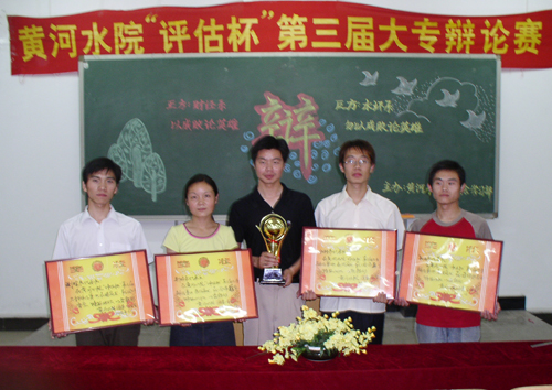 6月3日下午,以“迎评促建,学习成才”为主题的黄河水院“评估杯”第三届大专辩论赛总决赛在新校区JX2102教室举行。经过激烈辩论,财经系代表队力压水环系夺得本届辩论赛冠军,水环系代表队获得亚军。在先前的比赛中,测绘系代表队获得第三名,自动化系代表队、机电系代表队被评为团体优秀奖获得者。至此,为期一个多月的第三届大专辩论赛落下帷幕。