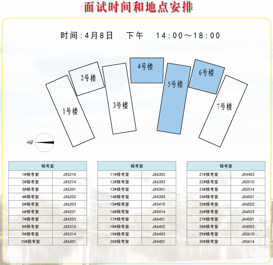 2.参加面试的考生,1#-14#候考室考生在教学楼群东侧排队集合,15#-29#候考室考生在教学楼群西侧排队集合,分批次有序入场。