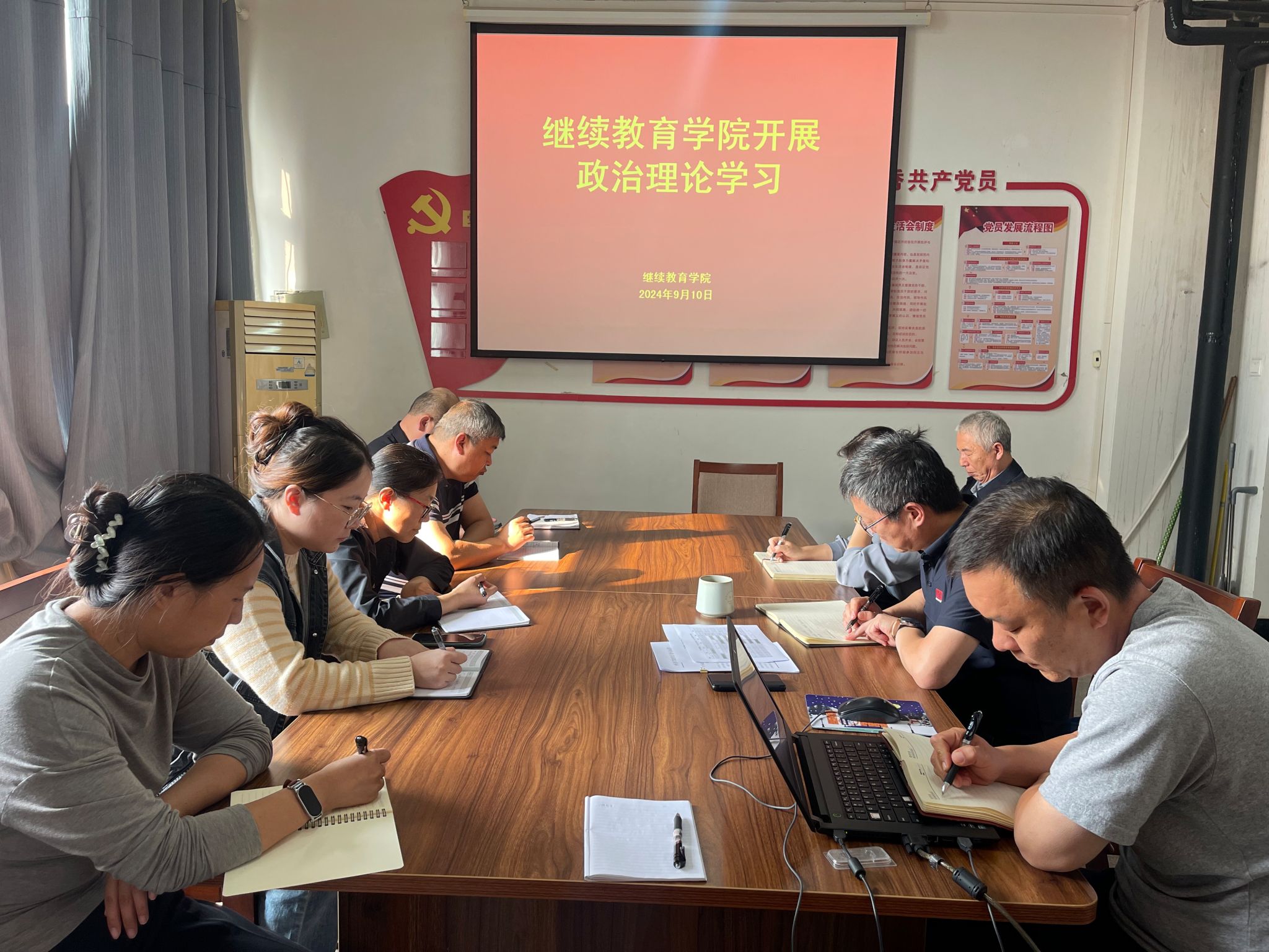 2024年9月10日,继续教育学院在4号楼四楼会议室开展政治理论学习,会议由院长薛建荣主持,全体教职工参加。