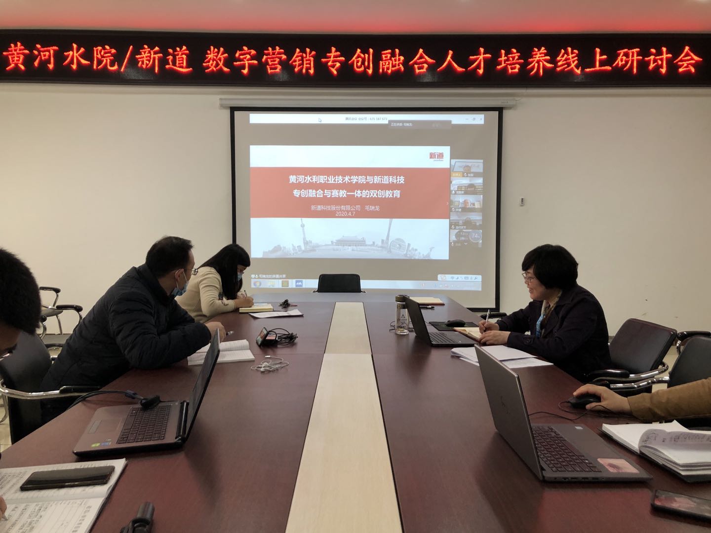 2020年4月7日,商务与管理学院主办了“数智化转型助力数字营销、助力双高院校高质量专创融合与赛教一体的双创教育”线上研讨会,邀请新道科技股份有限公司教育教学专家高级副总裁宋健在内的多名双创专家和数字营销专家在线参与专业研讨,商务与管理学院院长周爱荣主持会议。