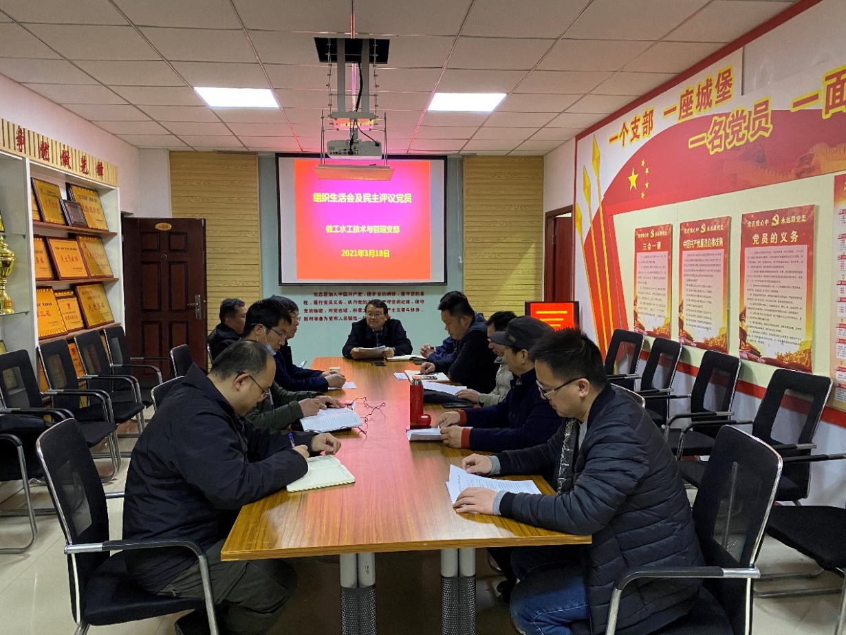 2021年3月18日上午,水利工程学院党总支教工水工技术与管理支部在SY5306党员活动室召开组织生活会和开展民主评议党员工作,会议由支部书记王建伟同志主持。