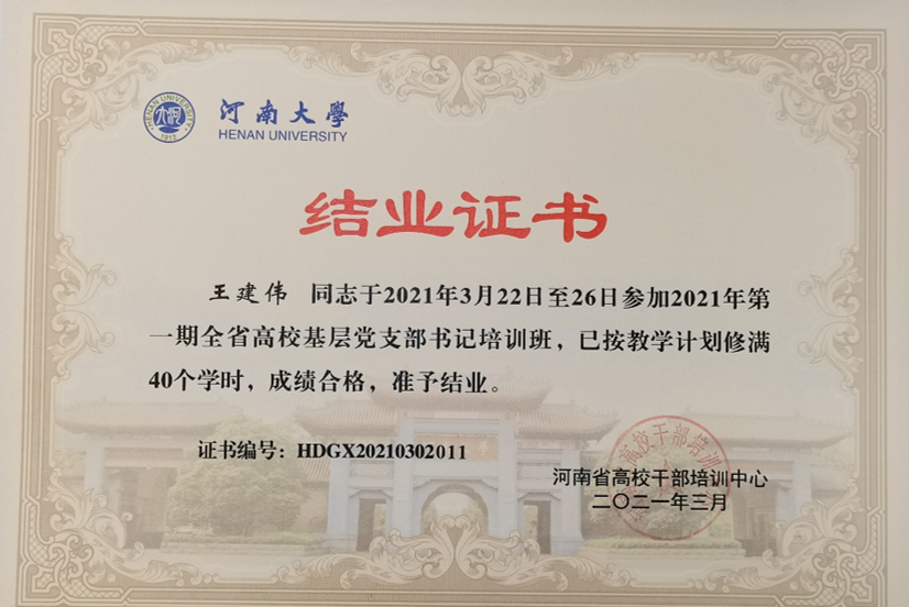 本次培训是由中共河南省高等学校工作委员会组织,河南大学(河南省高校)干部培训中心承办。培训形式不拘一格,包括专题讲座、现场教学、影像教学、微论坛、激情教学、小组讨论等多种形式;培训内容丰富多彩,涵盖十九届五中全会精神解读、中国共产党奋斗历程与启示、2021年两会精神解读和十四五规划、中国共产党支部工作条例解读、以改革创新的精神加强党组织建设等。在结业式上,王建伟同志应邀做了典型发言,他介绍了支部的基本情况及教育部“双带头人”教师党支部书记工作室的建设情况,并就如何增强基层党组织政治功能和组织力发表了自己观点和支部作法。