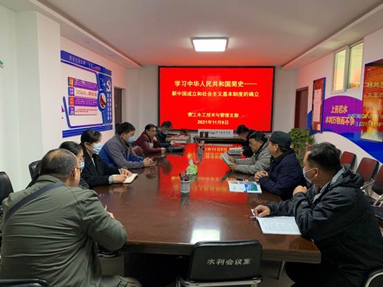 11月9日下午,水利工程学院党总支教工水工技术与管理支部在(SY5312)会议室开展了第一次中华人民共和国简史专题学习,学习活动由支部书记王建伟同志主持。