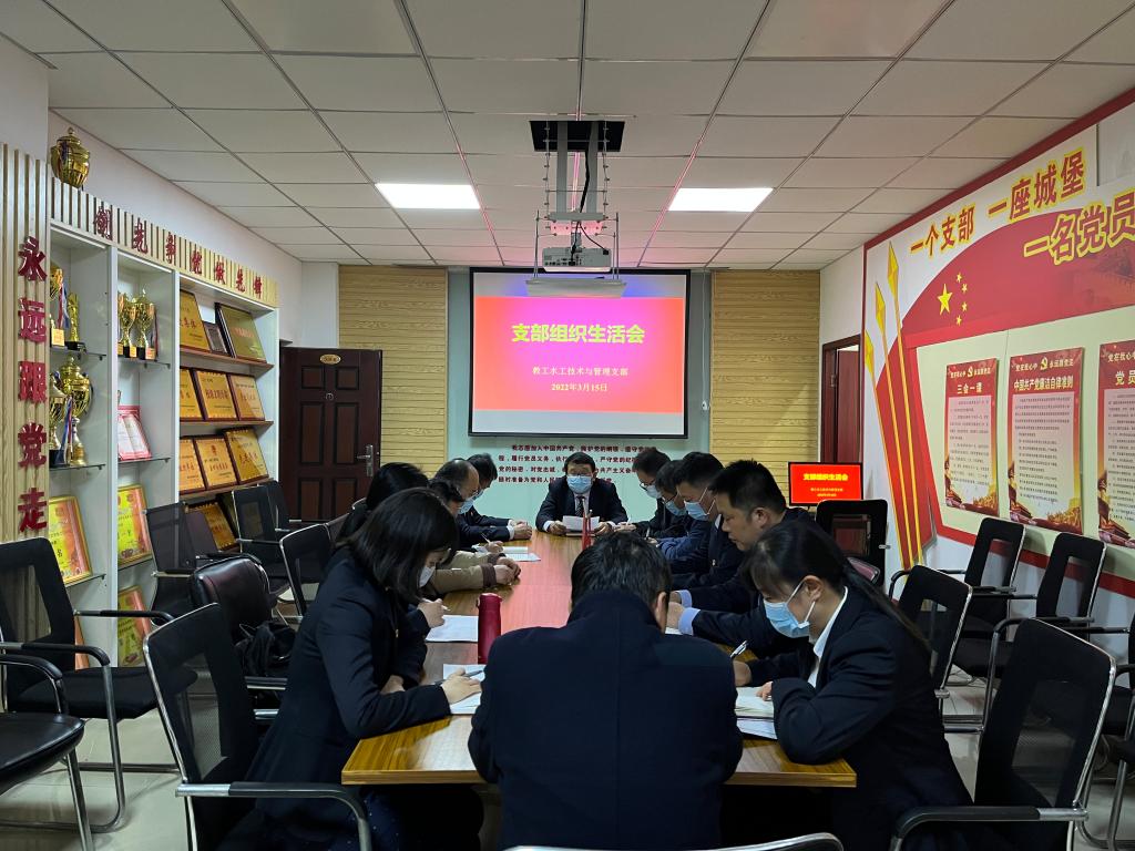 2022年3月15日下午,根据院党委下发的《关于召开2021年度基层党组织组织生活会和开展民主评议党员的通知》的要求,水利工程学院党总支教工水工技术与管理支部在SY5306党员活动室召开组织生活会,本次组织生活会由支部书记王建伟同志主持。