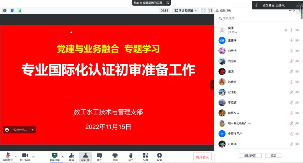11月15日,教工水工技术与管理支部组织“坚持党建引领,强化业务技能”线上专题学习,学习的主要内容是专业国际化认证初审准备。学习由支部副书记吴伟同志主持,全体教师通过腾讯会议在线参加。