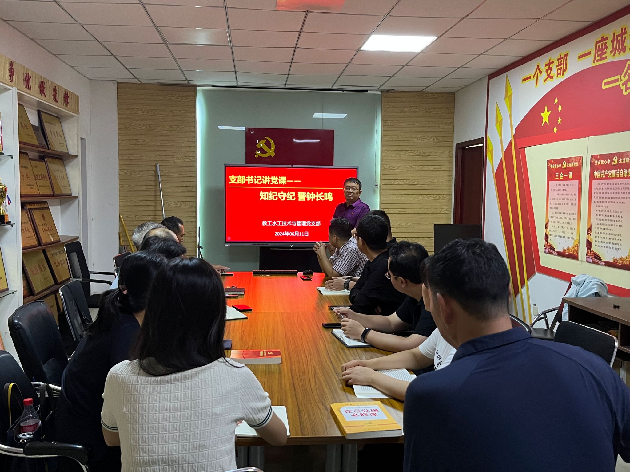6月11日下午,教工水工技术与管理党支部书记王建伟在党员活动室(实训楼SY5306)讲“知纪守纪 警钟长鸣”廉政党课。党总支书记王建设及教工水工技术与管理党支部全体党员参加了本次学习。