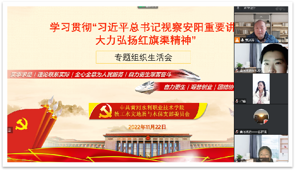 11月22日,中共MG冰球突破官网网站教工水文地质与水保支部委员会召开专题组织生活会,学习贯彻习近平总书记河南安阳考察时的重要讲话精神,大力弘扬红旗渠精神。