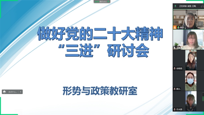 为进一步深入学习宣传贯彻党的二十大精神,贯彻习近平总书记关于思政课建设的重要论述,落实中央和省委有关思政课建设的安排和要求,研讨交流如何将党的二十大精神以及习近平总书记视察陕西延安和河南安阳重要讲话精神融入高校思政课,部署高校思政课《教学要点及参考资料》的推广使用,教育厅组织安排了11月7日——9日面向全省高校思政课教师的专题培训。形势与政策教研室全体专兼职教师参与线上培训,并于9日中午在线上召开《做好党的二十大精神“三进”研讨会》。教研室主任赵俊亚主持会议,教研室全体教师参会。