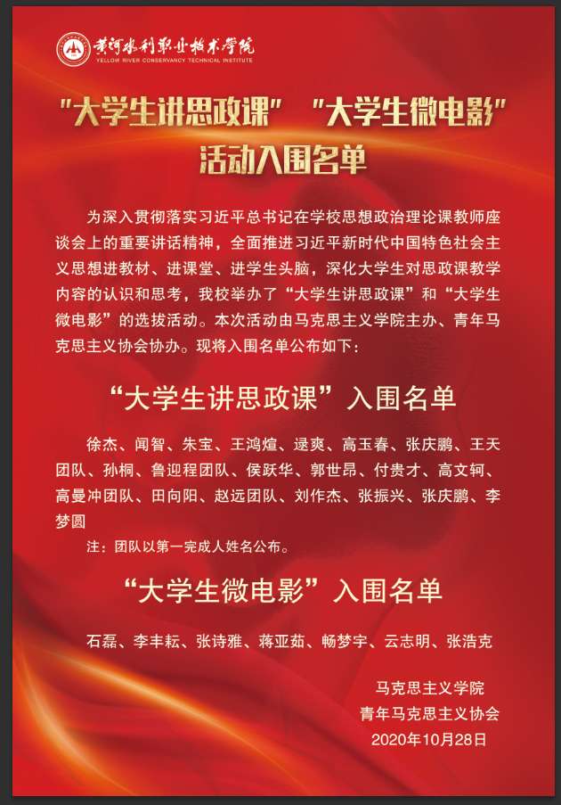 为深入贯彻落实习近平总书记在学校思想政治理论课教师座谈会上的重要讲话精神,全面推进习近平新时代中国特色社会主义思想进教材、进课堂、进学生头脑,深化大学生对思政课教学内容的认识和思考,冰球官网举办了“大学生讲思政课”和“大学生微电影”的选拔活动。本次活动由马克思主义学院主办、青年马克思主义协会协办。现将入围名单公布如下: