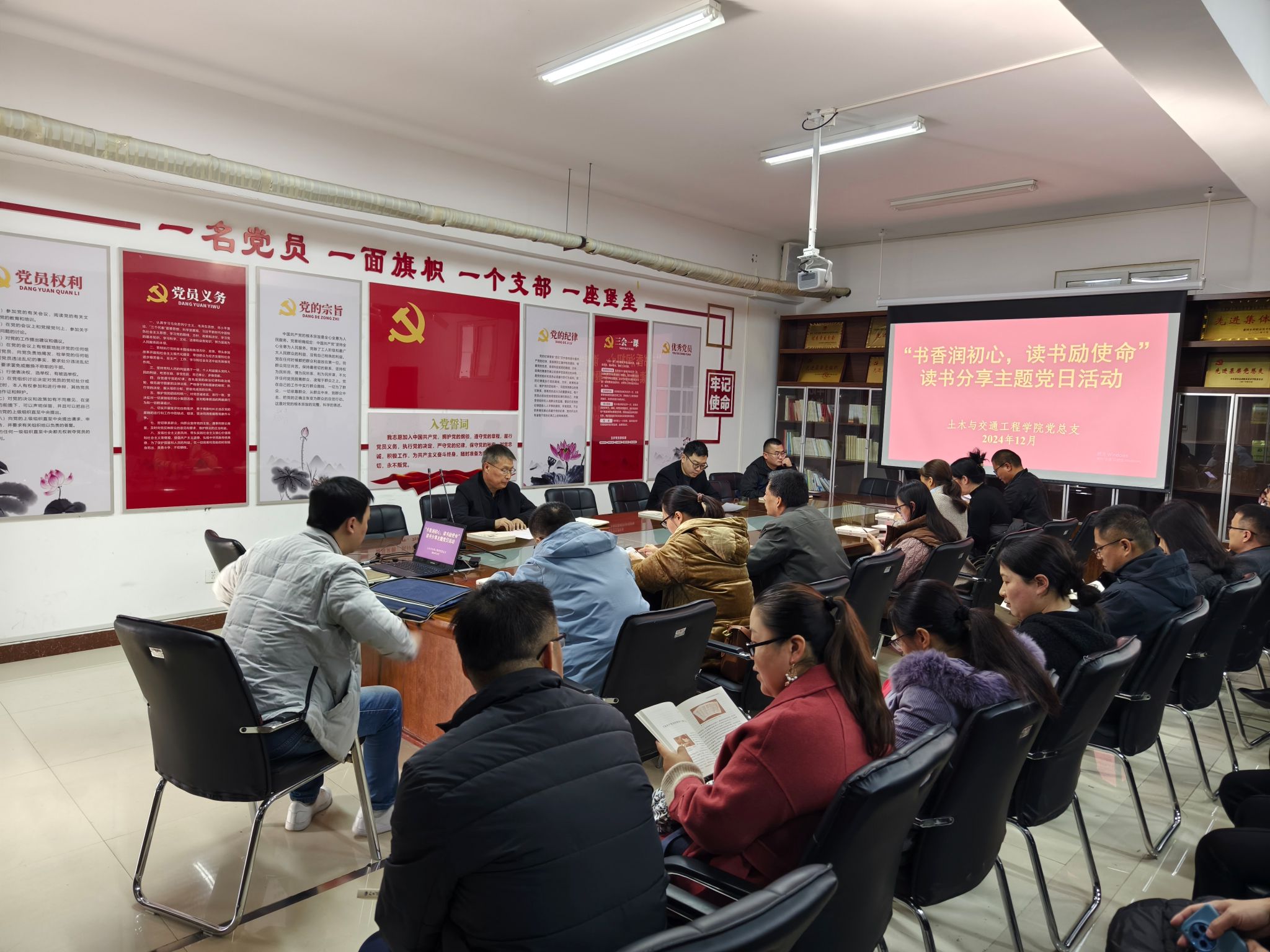 11月26日下午,土木与交通工程学院在学院会议室SY5319举行了主题为“书香润初心,读书励使命”的主题党日活动。本次活动旨在通过读书分享,进一步提升党员们的理论素养,强化使命担当,激发学习热情,营造浓厚的书香氛围。